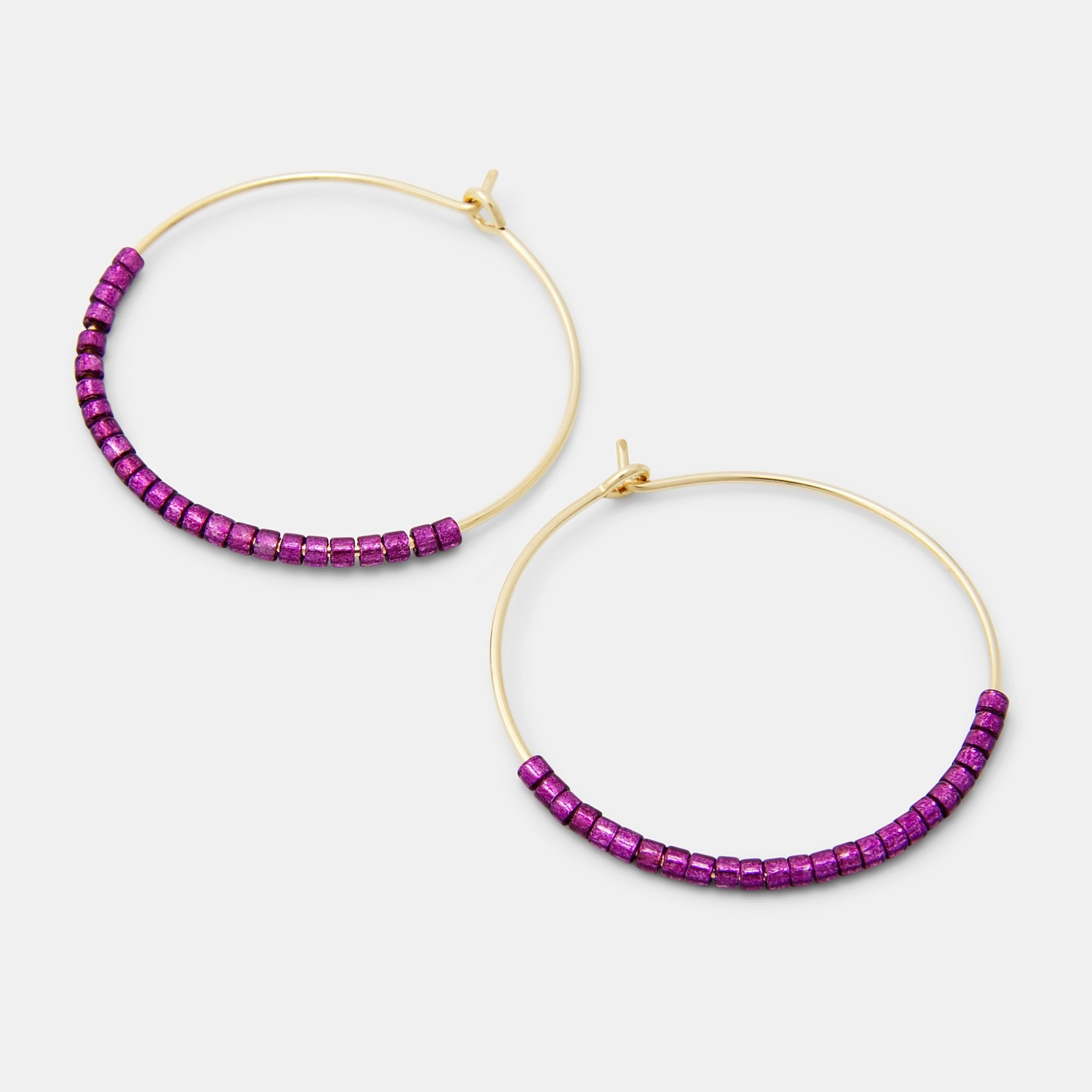 Each 14ct gold filled hoop features 25 tiny glass beads in a vivid, sparkly boysenberry tone. The lightweight beads shimmer as they move, creating a sense of colour and fun that works beautifully for casual looks.