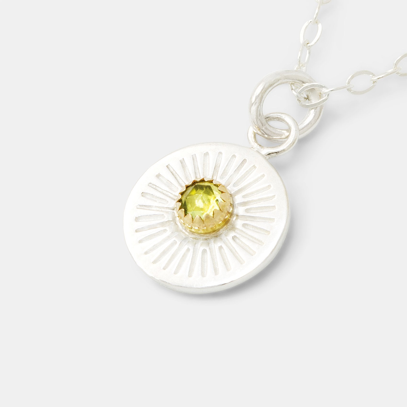 This petite Peridot Pendant Necklace features a symbolic starburst design in sterling silver with a sparkling natural peridot in a solid gold setting. It’s an ideal gift for an August birthday or a charming way to add soft green sparkle to your day.