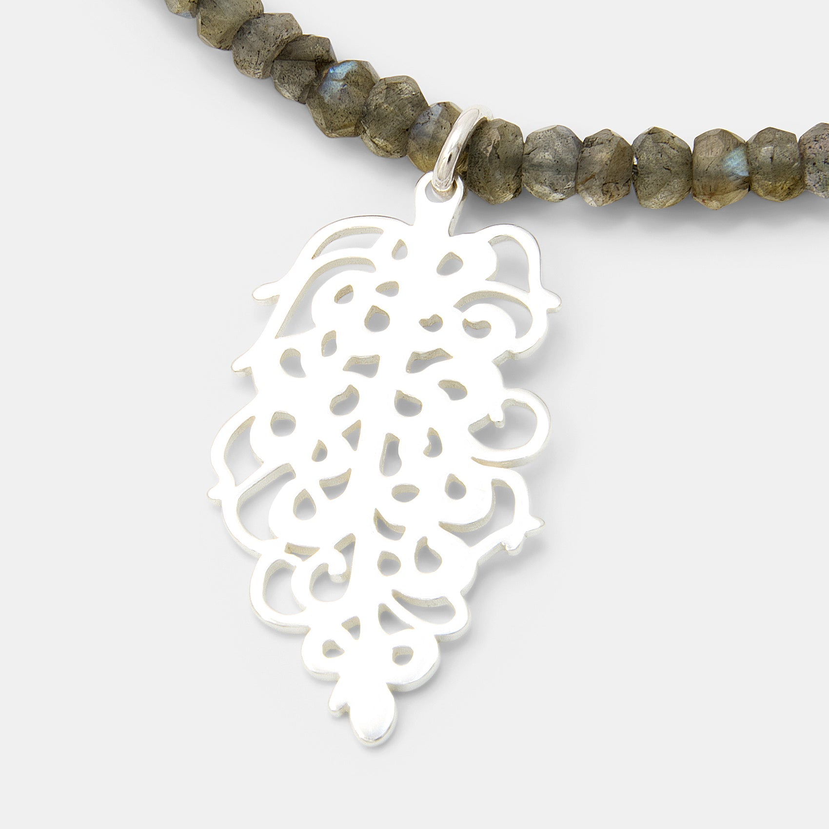 The sterling silver pendant is suspended from a strand of natural labradorite gemstone beads with a faceted finish. Each bead is unique, with colour variations and flashes of iridescence. The adjustable necklace can be worn from 40cm (15.7″) to 50cm (19.7″), and additional length can be added with a silver chain extender.