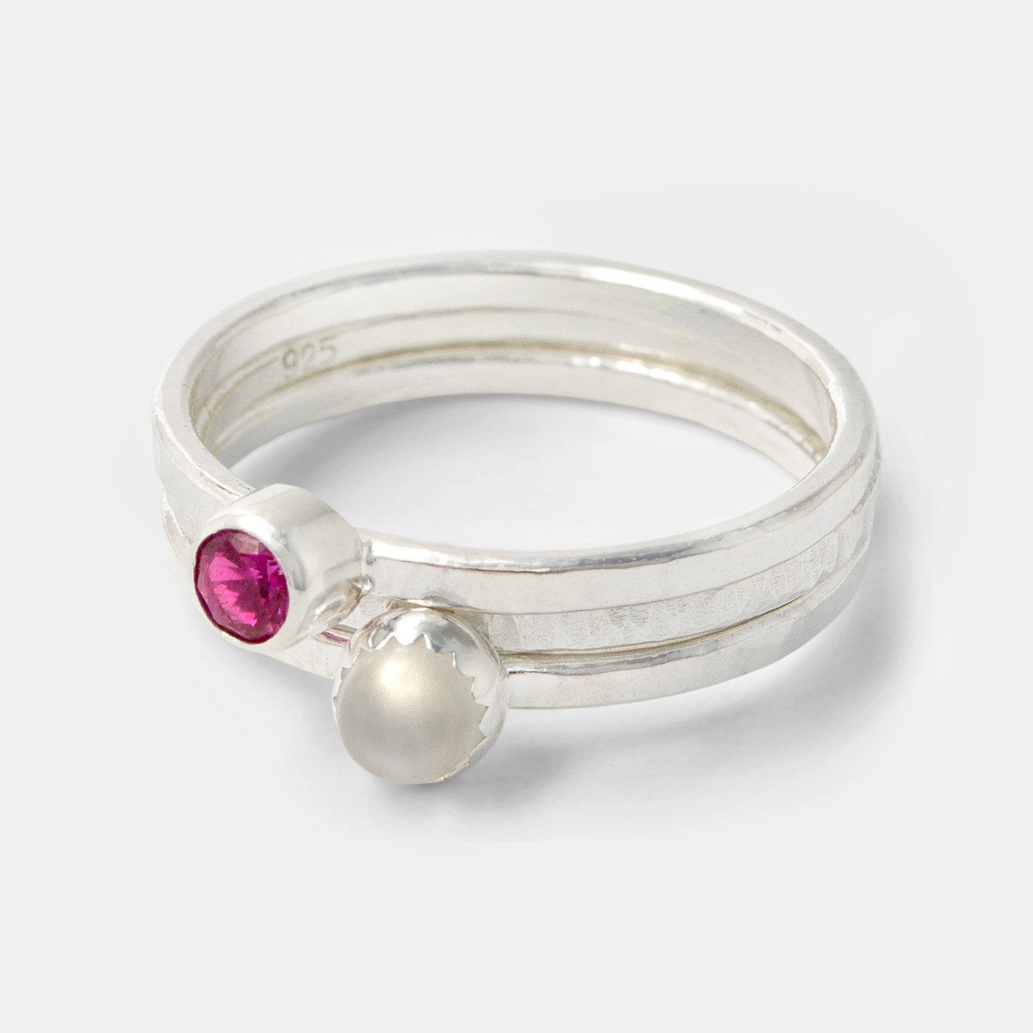 Silver Stacking Rings Set: Ruby & Moonstone