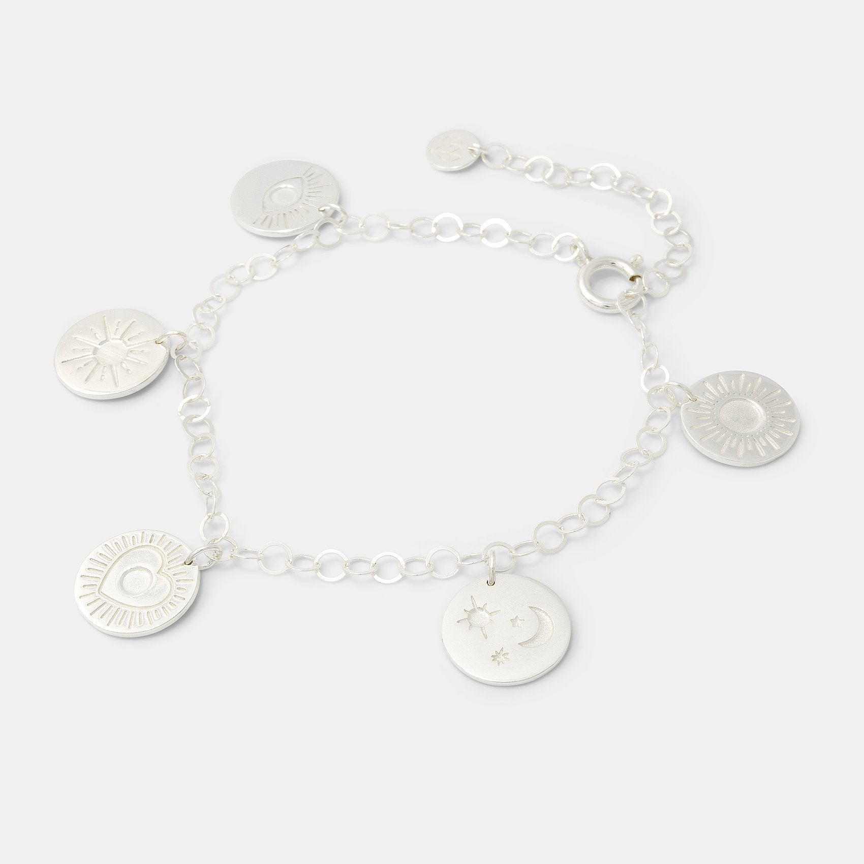 This enchanting sterling silver charm bracelet features all five of our symbolic amulet designs: the eye, heart, sunburst, moon & stars, and starburst. It’s a meaningful, sparkling piece to wear or gift, with each charm carrying wishes for protection, love, and guidance.