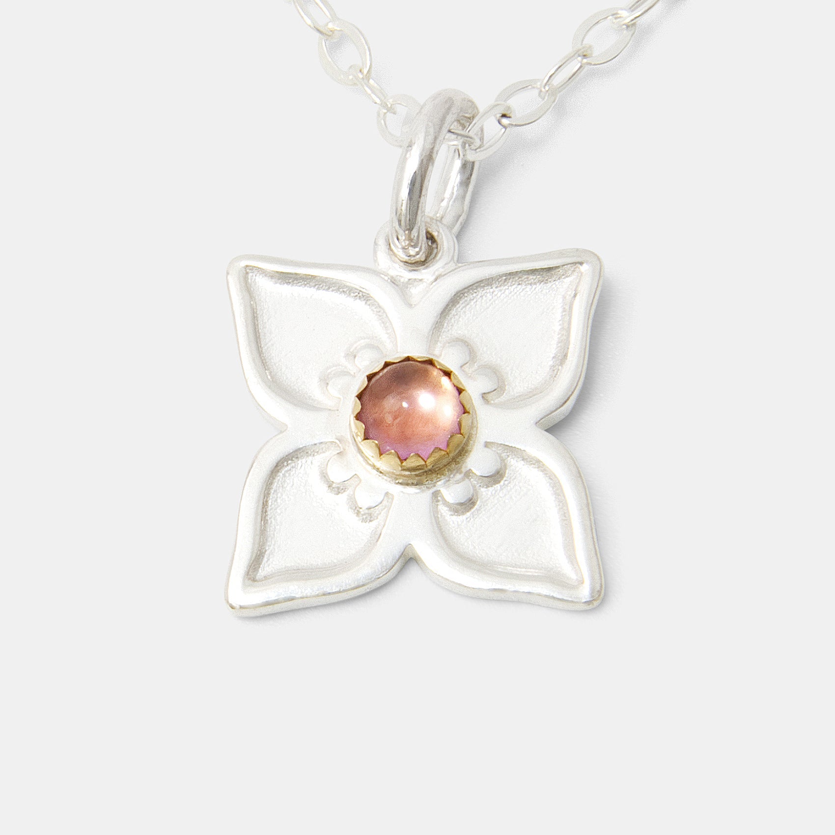 This boronia flower shaped pendant is small and made in shiny sterling silver. The recessed areas have a subtle texture to them. At the heart of the pendant is a 14ct solid gold setting with a serrated edge, which holds a small and beautiful soft pink tourmaline gemstone with a smooth cabochon cut.