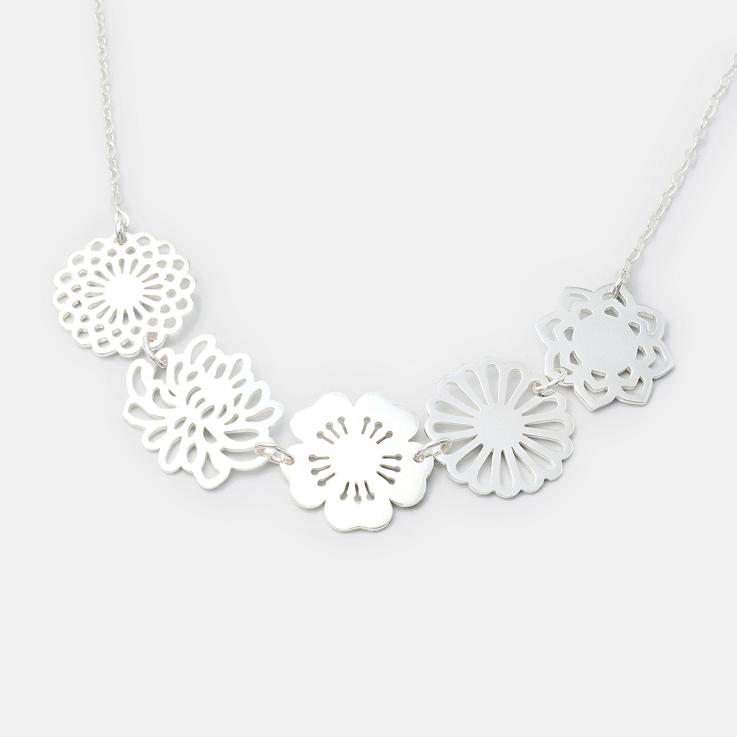 The flower pendants on this necklace are each made in shiny sterling silver. The flowers featured are a daisy, dahlia, lotus, chrysanthemum and cherry blossom.