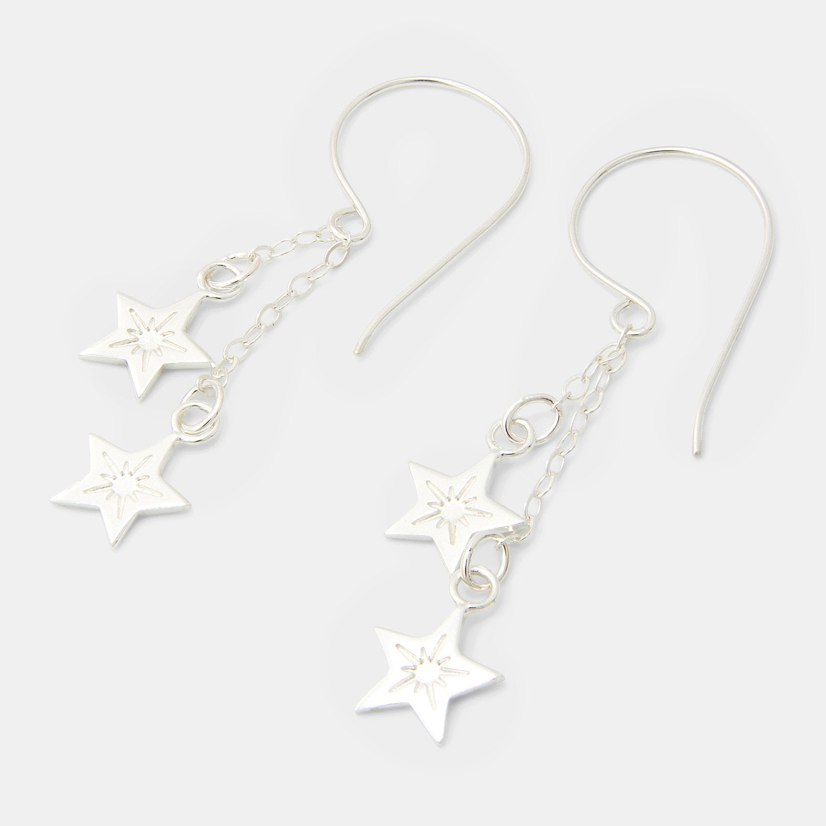 These stunning sterling silver chain dangle earrings each feature two shiny little stars suspended from delicate silver chains. With their elegant swing and subtle sparkle, they’ll dress up any outfit, from casual to more dressed-up occasions.